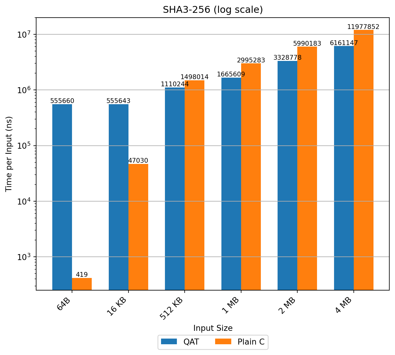 Conclusion: The hardware supports SHA3-256 but not SHAKE. Performance characteristics are similar: QAT only overtakes the CPU at large buffer sizes, making it unsuitable for PQ signature schemes where hashes are small and sequential.