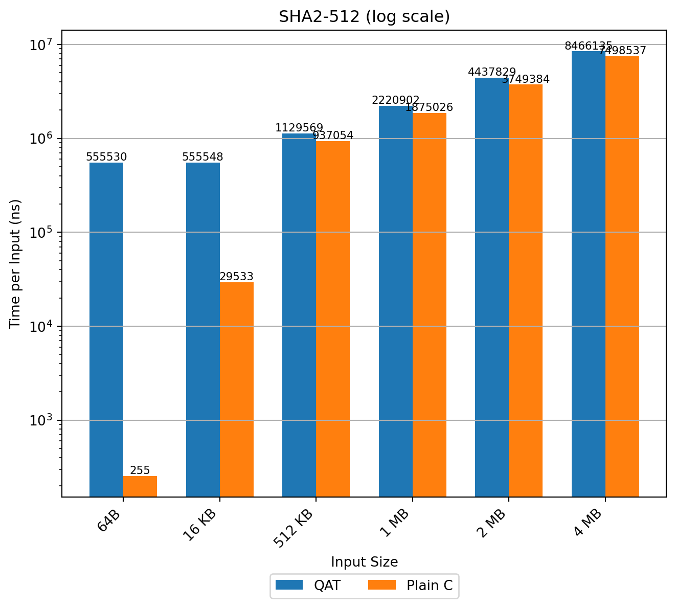 Conclusion: For SHA2-512, QAT never outperforms the host CPU at any tested size. Software remains the optimal choice for SLH-DSA workloads.